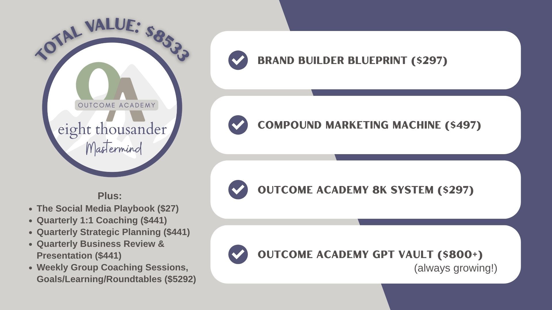 Our Collaborate Mastermind just evolved into a complete business growth ecosystem. Meet the Outcome Academy Summit Club... An Executive Mastermind Experience paired with every course, every tool, and our signature quarterly coaching system, all working together to help you grow with clarity and momentum.